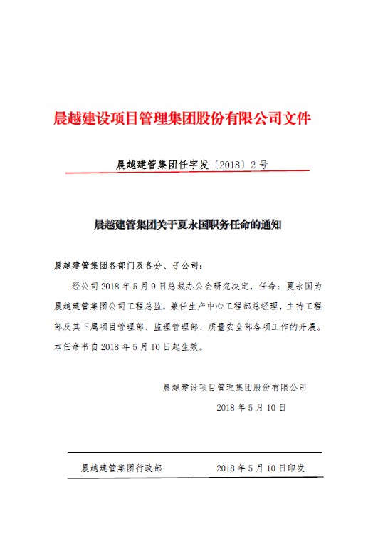 2018年5月10日,晨越建管集團(tuán)任字發(fā)【2018】2號文件頒發(fā)《關(guān)于夏永國職務(wù)任命的通知》,任命夏永國為集團(tuán)工程總監(jiān),兼任生產(chǎn)中心工程部總經(jīng)理,主持工程部及其下屬項目管理部、監(jiān)理管理部、質(zhì)量安全部各項工作。文件一經(jīng)發(fā)出,集團(tuán)全體員工為其祝賀。