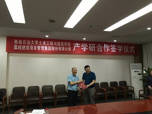 2018年7月2日,晨越建管黨委書記、董事長王宏毅受聘儀式在西南石油大學土木工程與建筑學院舉行,西南石油大學土木工程與建筑學院院長邵永波代表學院為王宏毅董事長頒發(fā)聘書,王董受聘西南石油大學土木工程與建筑學院兼職教授。