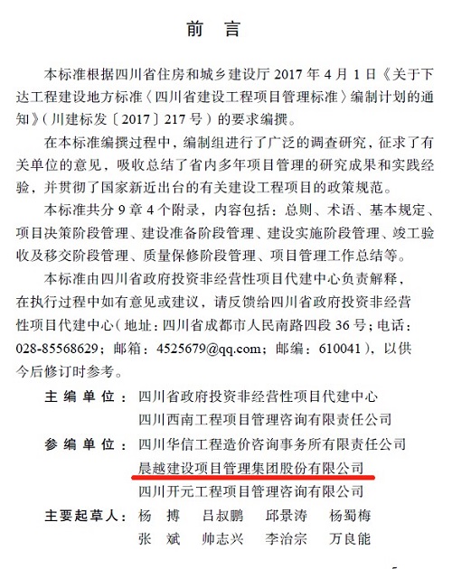 近日,由晨越建管集團(tuán)作為參編單位,由集團(tuán)員工馮玉翔、周琤等參與編寫的四川省工程建設(shè)地方標(biāo)準(zhǔn)《四川省建設(shè)工程項(xiàng)目管理標(biāo)準(zhǔn)》正式出版。該標(biāo)準(zhǔn)主編部門為四川省住房和城鄉(xiāng)建設(shè)廳;批準(zhǔn)部門為四川省住房和城鄉(xiāng)建設(shè)廳;由西南交通大學(xué)出版社出版。