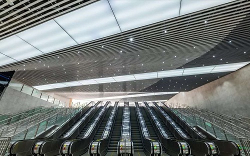 西博城地鐵站已經(jīng)呈現(xiàn)的實景,8條電梯一字排開的氣勢,四線換乘站的霸氣外露。