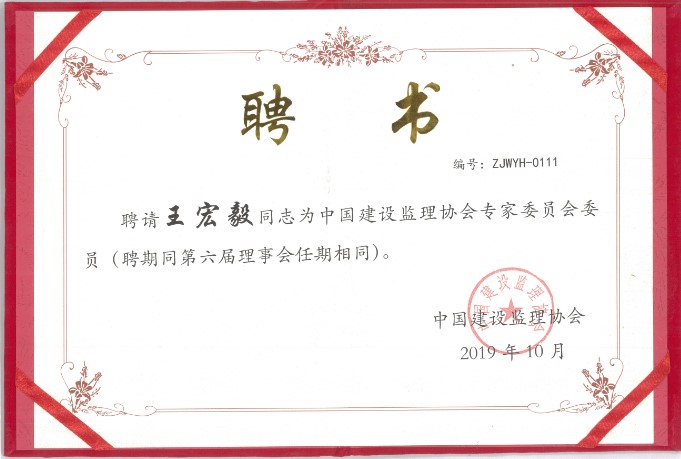 2019年10月16日,中國建設(shè)監(jiān)理協(xié)會發(fā)布[中建監(jiān)協(xié)(2019)59號],正式聘請晨越建管集團黨委書記、董事長王宏毅為中國建設(shè)監(jiān)理協(xié)會專家委員會委員。
