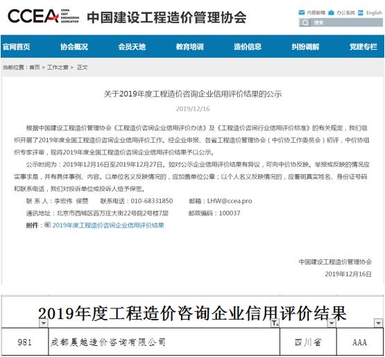 近日,集團(tuán)造價(jià)子公司在由中國(guó)建設(shè)工程造價(jià)管理協(xié)會(huì)組織的2019年度全國(guó)工程造價(jià)咨詢企業(yè)信用評(píng)價(jià)中,獲得代表最高級(jí)別的AAA信用等級(jí)。