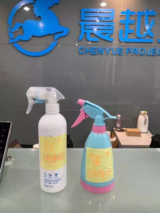 2月2日,行政部組織人員對集團辦公區(qū)進行全面消毒,包括電源開關、門把手等,前臺處準備了口罩、消毒水、牛奶、干糧等物資,以備不時之需。