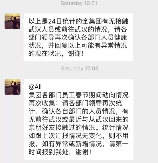2020年1月24日晨越建管集團開始建立信息報備制度并定期更新,統(tǒng)計集團員工身體健康情況提醒疫情防范并告知預防措施等,根據(jù)國家衛(wèi)健委、省市政府及權威機構下發(fā)的相關疫情消息,及時轉發(fā)告知全體員工。