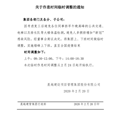 2月24日(農(nóng)歷二月初二),晨越建管集團(tuán)正式復(fù)工,在集團(tuán)董事會帶領(lǐng)下,晨越人認(rèn)真組織、平穩(wěn)生產(chǎn),作出系列復(fù)工前準(zhǔn)備工作,推動集團(tuán)復(fù)工穩(wěn)步有序,保障員工身體健康。