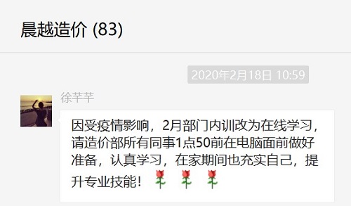 學(xué)無止境!疫情防控期間,在公司領(lǐng)導(dǎo)的帶領(lǐng)下,造價公司的同事們沒有因為在家辦公而松懈,反而利用這個期間積極組織大家共同學(xué)習(xí),共同進步,為今后的造價工作打下良好的基礎(chǔ)。