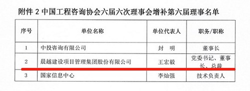 近日,《中國工程咨詢協(xié)會關(guān)于第六屆理事會第六次會議表決結(jié)果通知》(中咨協(xié)行業(yè)【2020】18號),宣布晨越建管集團(tuán)為中國工程咨詢協(xié)會第六屆理事單位、特邀常務(wù)理事單位。一同被當(dāng)選的還有國家信息中心等3家單位。