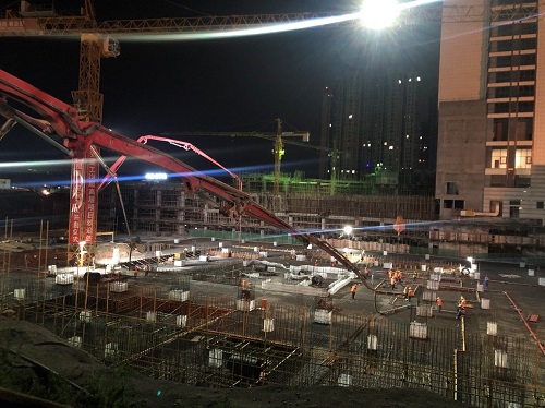 筏板作為建筑物最為重要的基礎(chǔ)承重構(gòu)件,如果施工管理不善,容易出現(xiàn)冷縫和漲縮裂縫。澆筑過程中晨越人秉承“愛崗敬業(yè)、科學(xué)管理”的精神,現(xiàn)場(chǎng)監(jiān)理人員不分晝夜全程輪班值守,期間監(jiān)理人員在商混站駐場(chǎng)監(jiān)控混凝土用料質(zhì)量、試配和發(fā)車供料情況,在澆筑現(xiàn)場(chǎng)對(duì)混凝土進(jìn)行坍落度試驗(yàn)測(cè)試,見證混凝土試壓塊制作,對(duì)澆筑順序、振搗工藝進(jìn)行全程監(jiān)督,發(fā)現(xiàn)問題立即整改,避免出現(xiàn)冷縫。