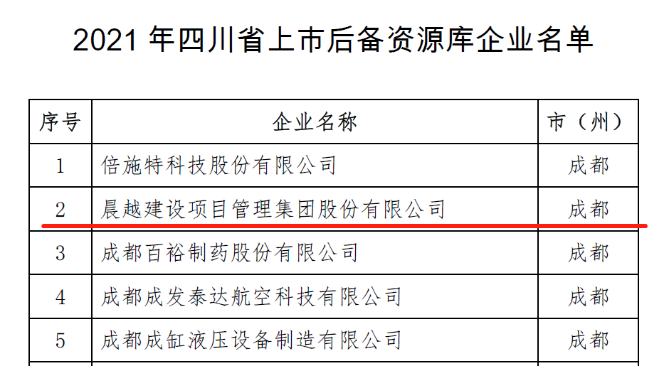 近日,四川省地方金融監(jiān)督管理局發(fā)布《關(guān)于印發(fā)2021年四川省上市后備企業(yè)資源庫名單的函》,公布晨越建管集團(tuán)納入2021年四川省上市后備企業(yè)資源庫。