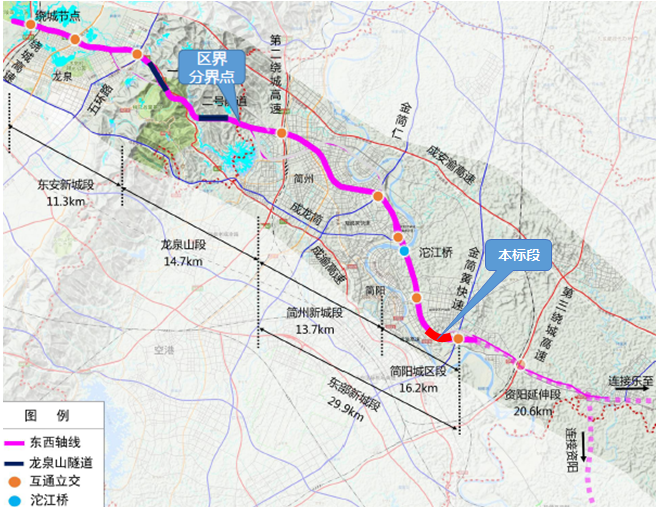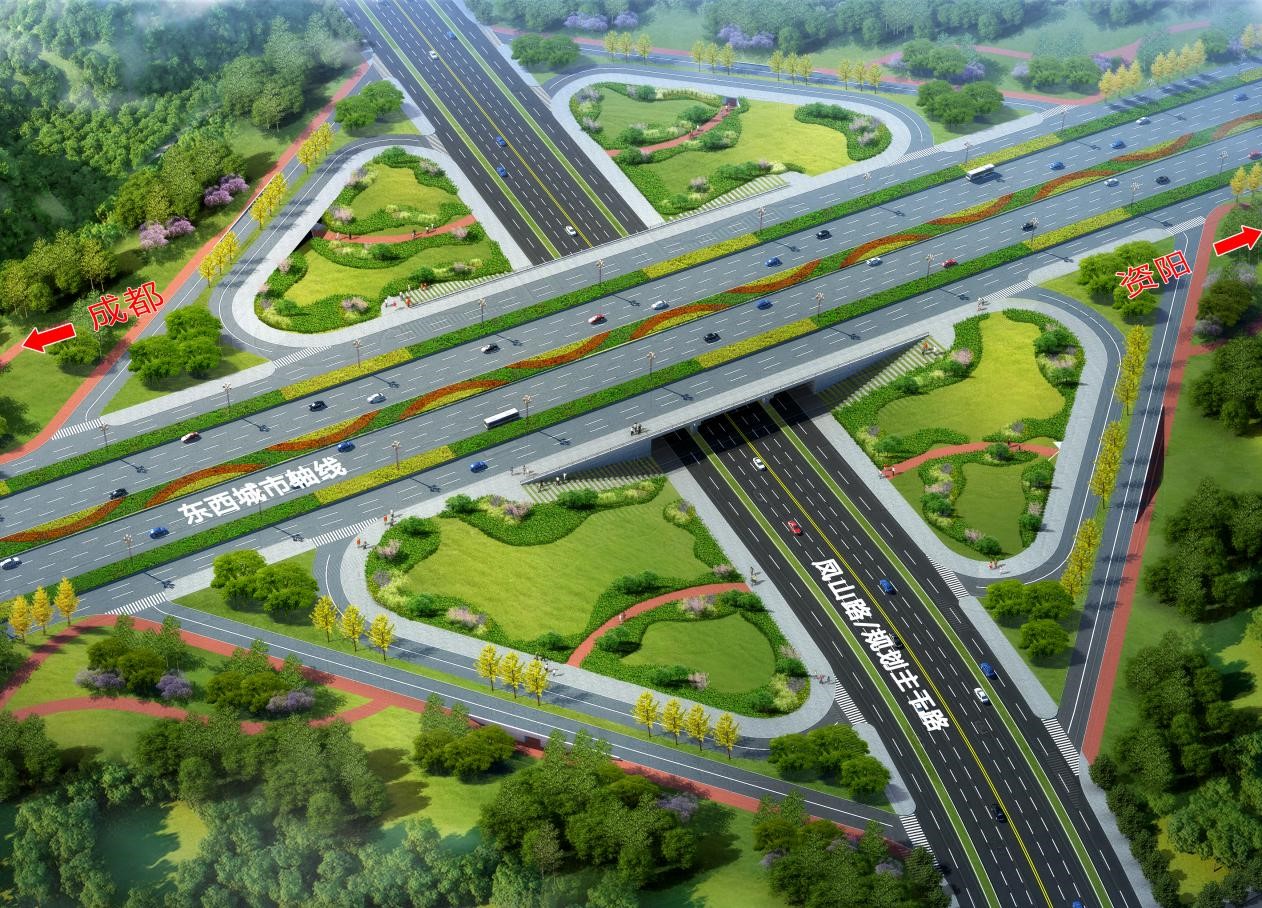 成都東西城市軸線西起于都江堰市區(qū),東面至三繞外成都市的市域邊界,全長約150公里。整個東西城市軸線串聯都江堰、龍泉驛、簡州新城、簡陽等9個區(qū)域,連接沿線14個產業(yè)功能區(qū)。東西城市軸線(東段)簡陽段西起于龍泉驛區(qū)界,串聯簡州新城、簡陽市,東至金簡黃快速路,按城市快速路標準設置,總長32公里,結合公園城市建設理念,建成后將是城市交通軸、景觀軸、產業(yè)軸。