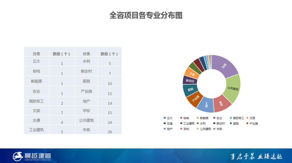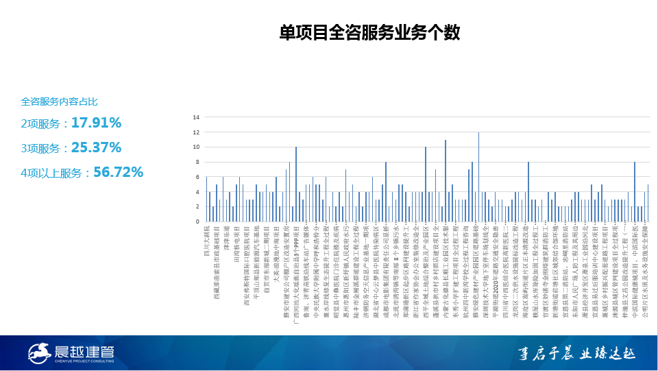 截止目前,晨越正在實(shí)施的全咨項(xiàng)目134個(gè),持續(xù)在山東、安徽、云南、寧夏、西藏、福建等多地市實(shí)現(xiàn)全咨首標(biāo)的突破,總投資已超1200億元,省外項(xiàng)目數(shù)占比70%,省內(nèi)項(xiàng)目數(shù)占比30%,其中:全咨服務(wù)內(nèi)容含2項(xiàng)的占17.91%;3項(xiàng)的占25.37%;4項(xiàng)以上的占56.72%。全咨項(xiàng)目類型包括云計(jì)算與大數(shù)據(jù)、水利水電、新農(nóng)村、新能源、醫(yī)院、學(xué)校、產(chǎn)業(yè)園、國(guó)防軍工、工業(yè)建筑、市政、交通、公共建筑、文旅等多個(gè)建設(shè)領(lǐng)域。
