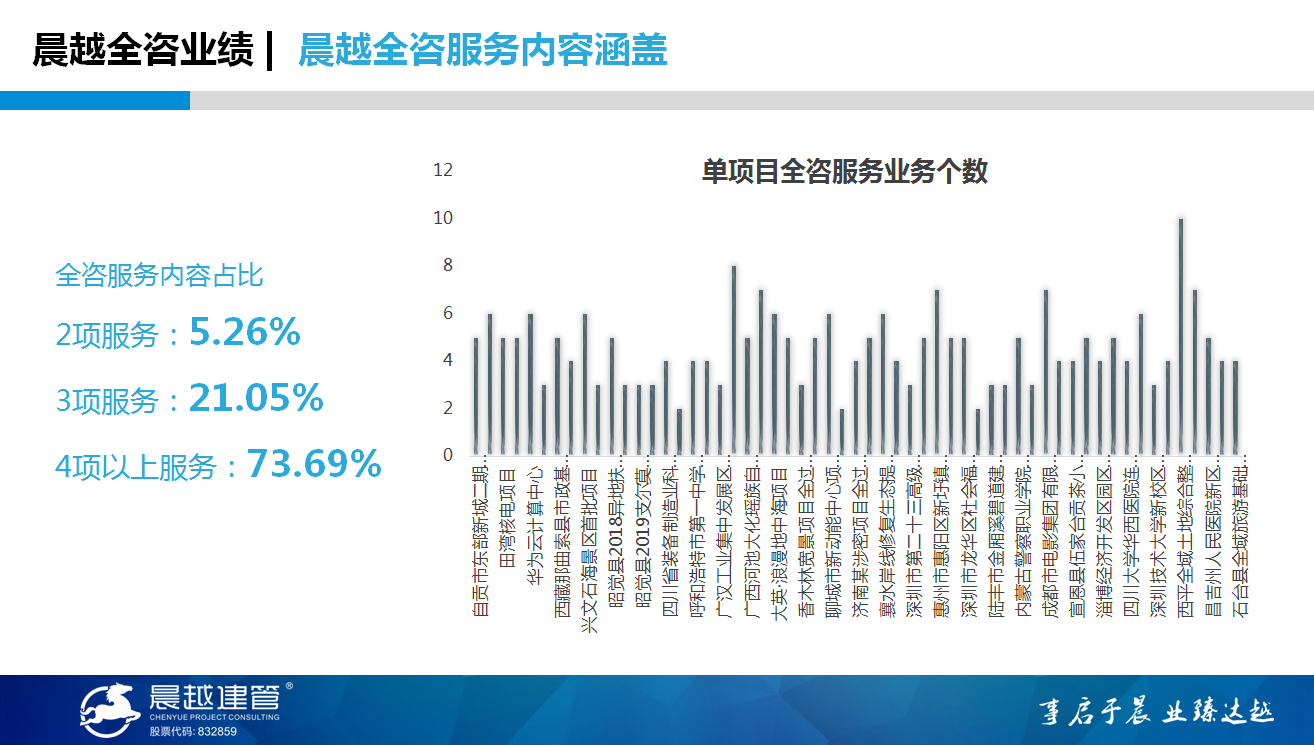 2021年,晨越全咨項(xiàng)目先后在四川、浙江、廣東、廣西、山東、內(nèi)蒙古、河南、遼寧、湖北、福建、河北等多省落地,全咨項(xiàng)目類型覆蓋鄉(xiāng)村振興、房建、市政、交通、水利、核電、國(guó)防軍工、產(chǎn)業(yè)園區(qū)、旅游區(qū)、教育、醫(yī)療衛(wèi)生、機(jī)場(chǎng)等多個(gè)建設(shè)領(lǐng)域。典型項(xiàng)目包括土地綜合整治領(lǐng)域第一個(gè)全咨項(xiàng)目——綿陽(yáng)西平全域土地綜合整治及產(chǎn)業(yè)園區(qū)建設(shè)項(xiàng)目,國(guó)防領(lǐng)域的全過程咨詢項(xiàng)目——東北軍用機(jī)場(chǎng)設(shè)施建設(shè)及整治項(xiàng)目,投資決策階段綜合咨詢服務(wù)項(xiàng)目——內(nèi)蒙古烏蘭察布市化德縣長(zhǎng)順工業(yè)園區(qū)技術(shù)服務(wù)項(xiàng)目,服務(wù)范圍最廣的全咨項(xiàng)目——綿陽(yáng)市南山路4號(hào)房地產(chǎn)開發(fā)建設(shè)項(xiàng)目等。