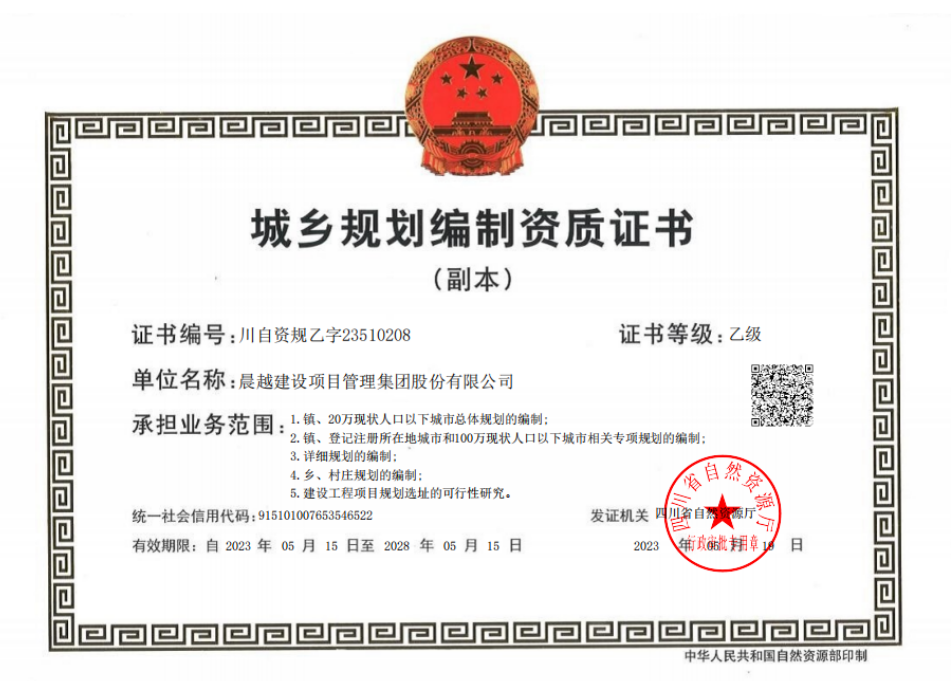 近日,集團取得四川省自然資源廳頒發(fā)的《城鄉(xiāng)規(guī)劃編制資質(zhì)證書》乙級資質(zhì),證書編號:川自資規(guī)乙字23510208,有效期至2028年05月15日。