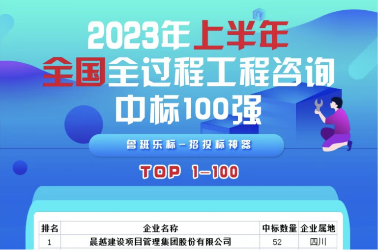 報(bào)道顯示,根據(jù)全國(guó)各省市公共資源交易中心數(shù)據(jù)統(tǒng)計(jì),2023年上半年全國(guó)全過程工程咨詢中標(biāo)100強(qiáng)中,晨越建管集團(tuán)全過程工程咨詢中標(biāo)數(shù)52個(gè),位居排行榜榜首。