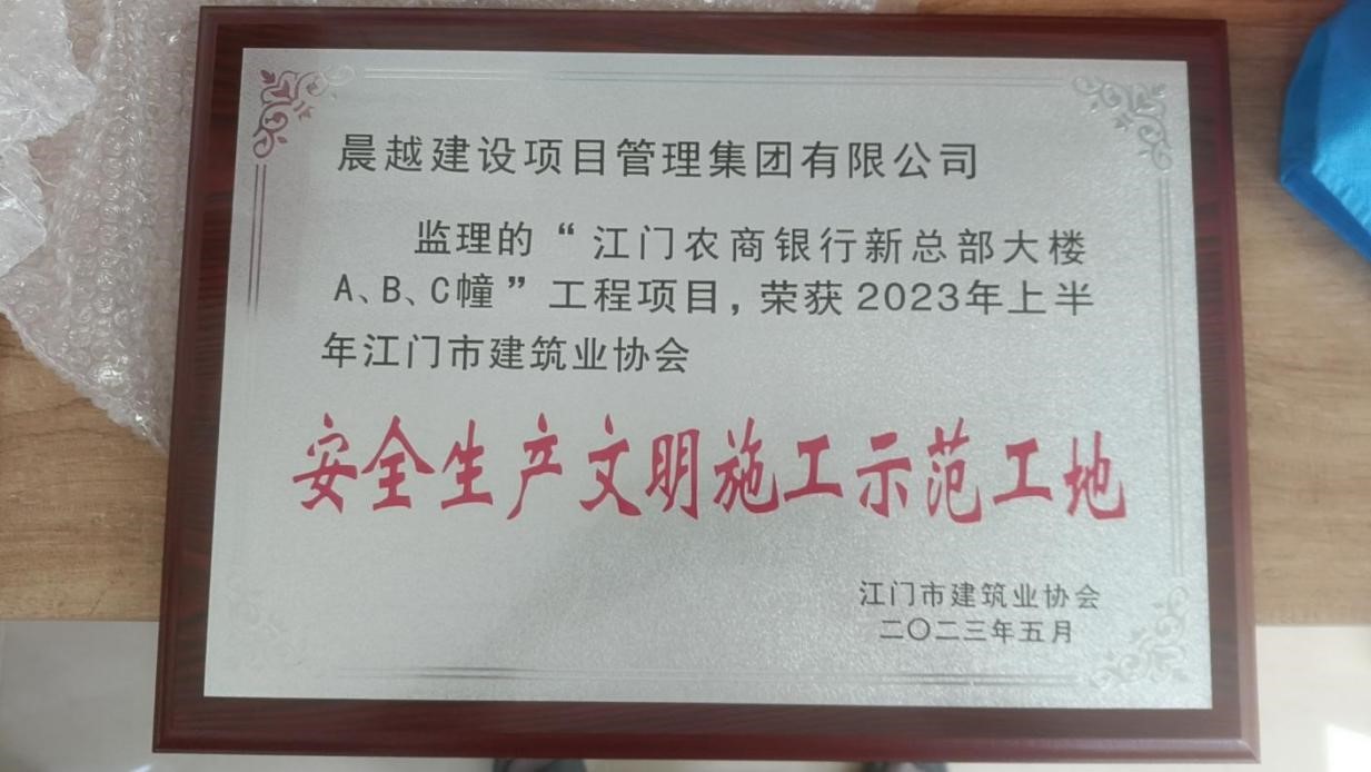 近日,集團(tuán)承擔(dān)的江門農(nóng)村商業(yè)銀行股份有限公司新總部大樓建設(shè)項(xiàng)目,榮獲江門市建筑業(yè)協(xié)會頒發(fā)的2023年上半年“安全生產(chǎn)文明施工示范工地”稱號。