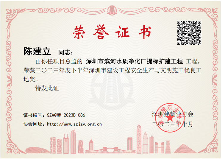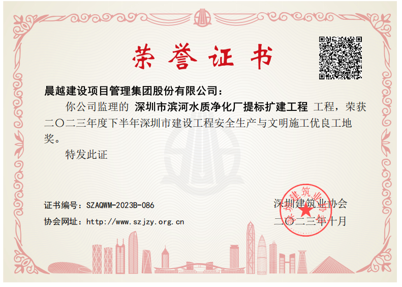 近日,集團承擔的深圳市濱河水質凈化廠提標擴建工程項目,榮獲深圳建筑業(yè)協(xié)會“2023年度下半年深圳市建設工程安全生產與文明施工優(yōu)良工地獎”。