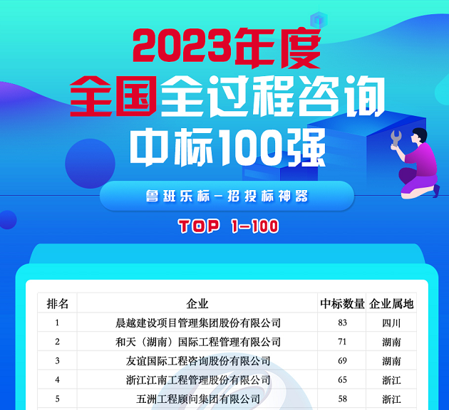 2024年1月16日,魯班樂標(biāo)發(fā)布“2023年度全國(guó)全過(guò)程咨詢中標(biāo)100強(qiáng)”榜單,晨越建管集團(tuán)以中標(biāo)83個(gè)項(xiàng)目位列百?gòu)?qiáng)榜首。這是晨越繼榮獲2020、2021、2022年度全國(guó)全過(guò)程咨詢中標(biāo)百?gòu)?qiáng)榜首之后,連續(xù)第四年榮獲全國(guó)全咨中標(biāo)百?gòu)?qiáng)榜第一名!