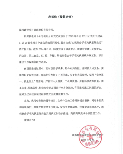 近日,集團(tuán)收到江蘇核電有限公司發(fā)來的《表揚(yáng)信》,對田灣核電站1-6號機(jī)組分布式光伏項(xiàng)目部予以表揚(yáng)。《表揚(yáng)信》中提到,田灣核電站1-6號機(jī)組分布式光伏項(xiàng)目實(shí)現(xiàn)首個(gè)光伏系統(tǒng)并網(wǎng)發(fā)電,提前完成“實(shí)現(xiàn)部分子項(xiàng)光伏系統(tǒng)投運(yùn)”的工作目標(biāo),對晨越項(xiàng)目團(tuán)隊(duì)不畏困難、實(shí)干擔(dān)當(dāng)?shù)墓ぷ骶裉岢霰頁P(yáng)!