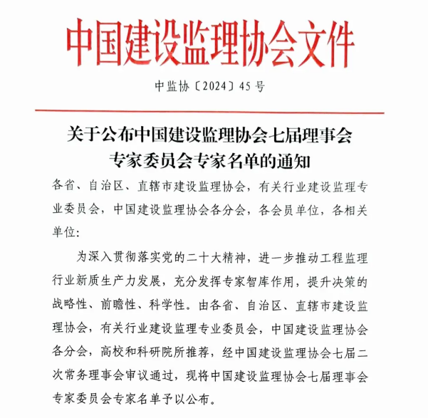 近日,中國建設(shè)監(jiān)理協(xié)會發(fā)布《關(guān)于公布中國建設(shè)監(jiān)理協(xié)會七屆理事會專家委員會專家名單的通知》([中監(jiān)協(xié)(2024)45號]),集團(tuán)黨委書記、董事長王宏毅再次獲聘中國建設(shè)監(jiān)理協(xié)會專家委員會委員。