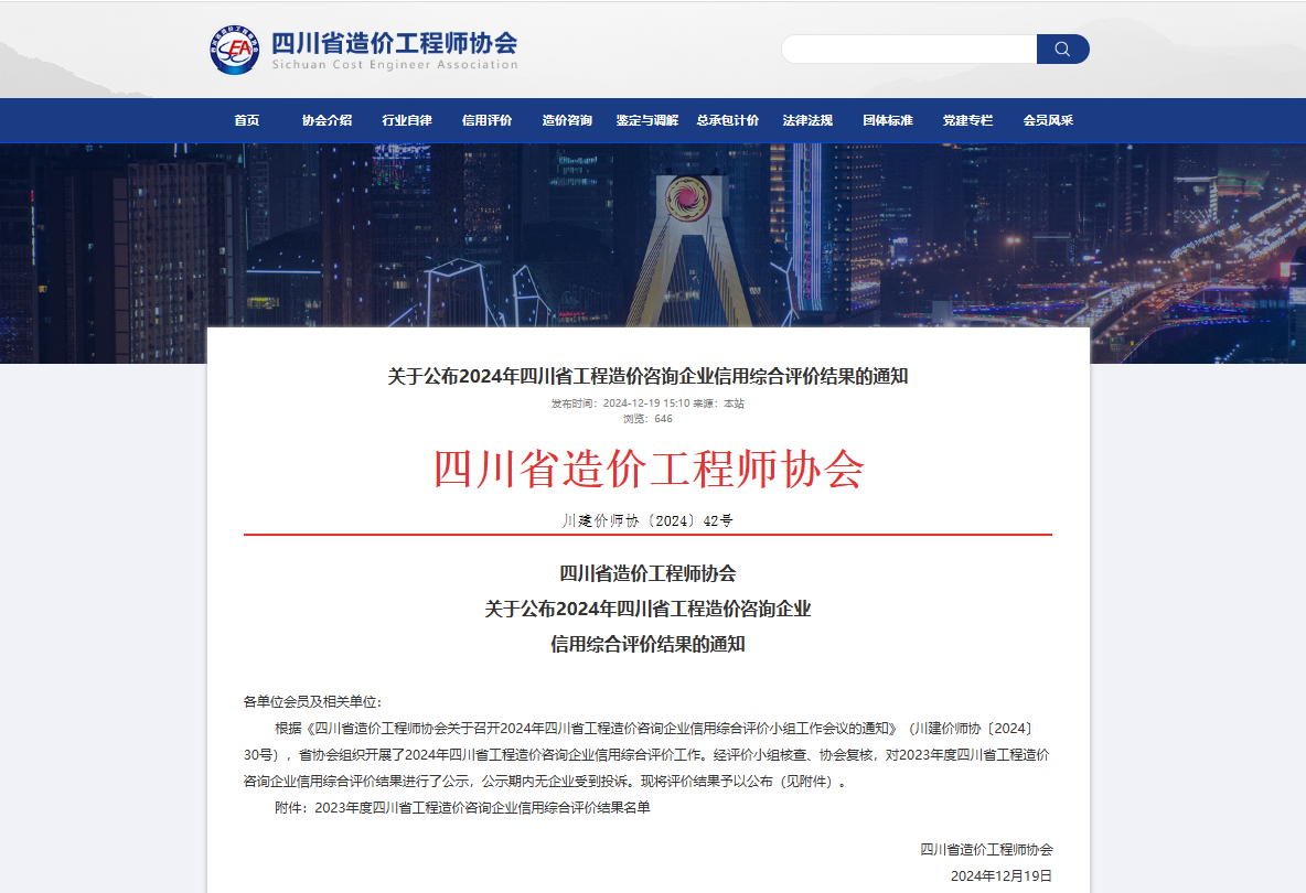 2024年11月,資質(zhì)管理部、造價(jià)部根據(jù)四川省造價(jià)工程師協(xié)會(huì)《四川省工程造價(jià)咨詢企業(yè)信用綜合評(píng)價(jià)辦法》的通知要求,準(zhǔn)備并提交了工程造價(jià)咨詢企業(yè)信用評(píng)價(jià)申報(bào)材料。經(jīng)過協(xié)會(huì)評(píng)審專家現(xiàn)場對(duì)集團(tuán)經(jīng)營業(yè)績、人員結(jié)構(gòu)、企業(yè)管理、社會(huì)貢獻(xiàn)、企業(yè)榮譽(yù)等方面進(jìn)行評(píng)審,四川省造價(jià)工程師協(xié)會(huì)于近日公布集團(tuán)為“2023年度四川省工程造價(jià)咨詢企業(yè)AAA信用綜合等級(jí)”。