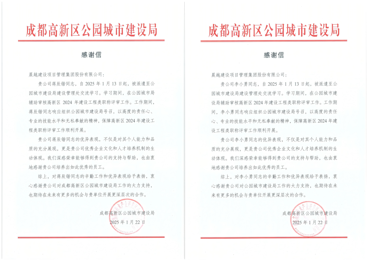 近日,晨越建管集團(tuán)收到來自成都高新區(qū)公園城市建設(shè)局的《感謝信》,對(duì)集團(tuán)員工李小勇和蔣辰鍇支持高新區(qū)2024年建設(shè)工程類職稱評(píng)審工作表示誠摯的感謝。
