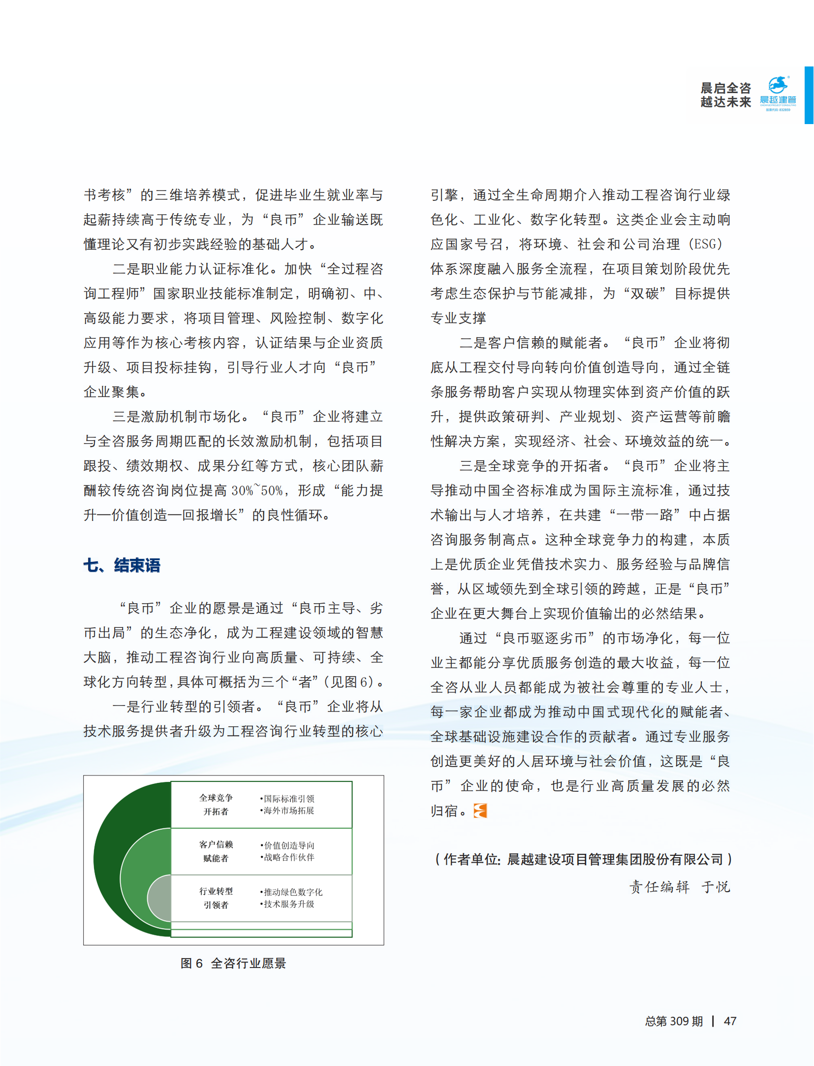 作為全過程工程咨詢龍頭企業(yè)的掌舵者,王宏毅董事長(zhǎng)在實(shí)踐中摸索總結(jié),應(yīng)市場(chǎng)所需,帶領(lǐng)晨越建管集團(tuán)在國(guó)內(nèi)率先開創(chuàng)出“項(xiàng)目管理+專業(yè)咨詢”的全過程工程咨詢模式,并成為目前國(guó)內(nèi)主流的全咨模式,趟出了一條前無古人的全過程工程咨詢中國(guó)化創(chuàng)新發(fā)展之路。在實(shí)踐中,王宏毅董事長(zhǎng)帶領(lǐng)晨越建管集團(tuán)連續(xù)五年奪得“全國(guó)全過程工程咨詢中標(biāo)百?gòu)?qiáng)企業(yè)”第一名,先后主編中國(guó)工程咨詢協(xié)會(huì)全過程工程咨詢系列團(tuán)體標(biāo)準(zhǔn)、四川省全過程工程咨詢服務(wù)標(biāo)準(zhǔn),主編《全過程工程咨詢理論與實(shí)踐系列叢書》《大型劇院類項(xiàng)目全過程工程咨詢-四川大劇院實(shí)踐案例》等著作,為全過程工程咨詢事業(yè)發(fā)展作出了積極貢獻(xiàn)。王宏毅董事長(zhǎng)在全咨實(shí)踐中不斷對(duì)全過程工程咨詢發(fā)展規(guī)律、市場(chǎng)機(jī)制、產(chǎn)業(yè)生態(tài)、未來趨勢(shì)等進(jìn)行研究,此次發(fā)表文章《良幣驅(qū)逐劣幣:推動(dòng)全過程工程咨詢市場(chǎng)優(yōu)勝劣汰》,正是其在“十四五”規(guī)劃收官、“十五五”規(guī)劃編制之際,對(duì)新形勢(shì)下全過程工程咨詢市場(chǎng)發(fā)展的系統(tǒng)性思考和深刻洞見。?