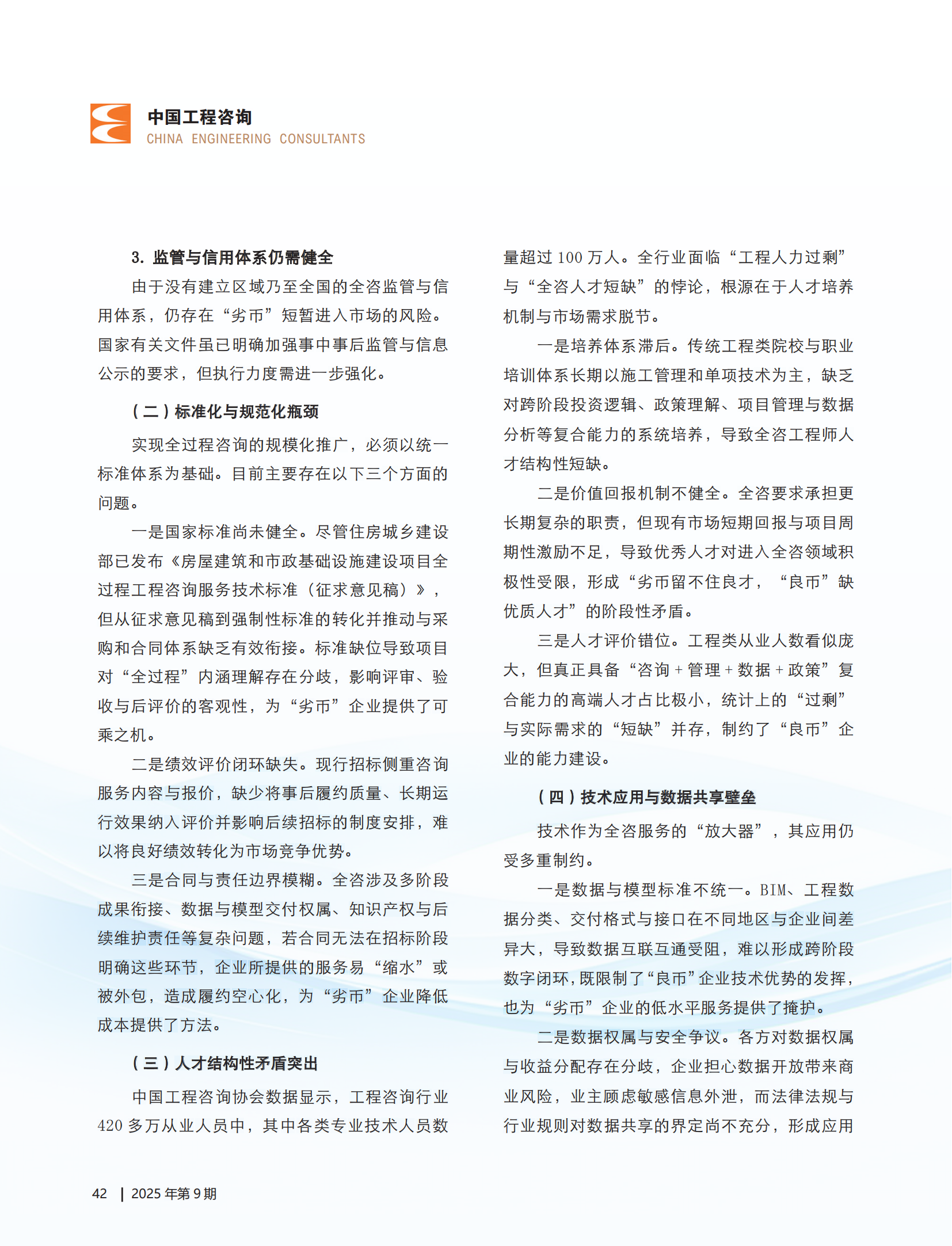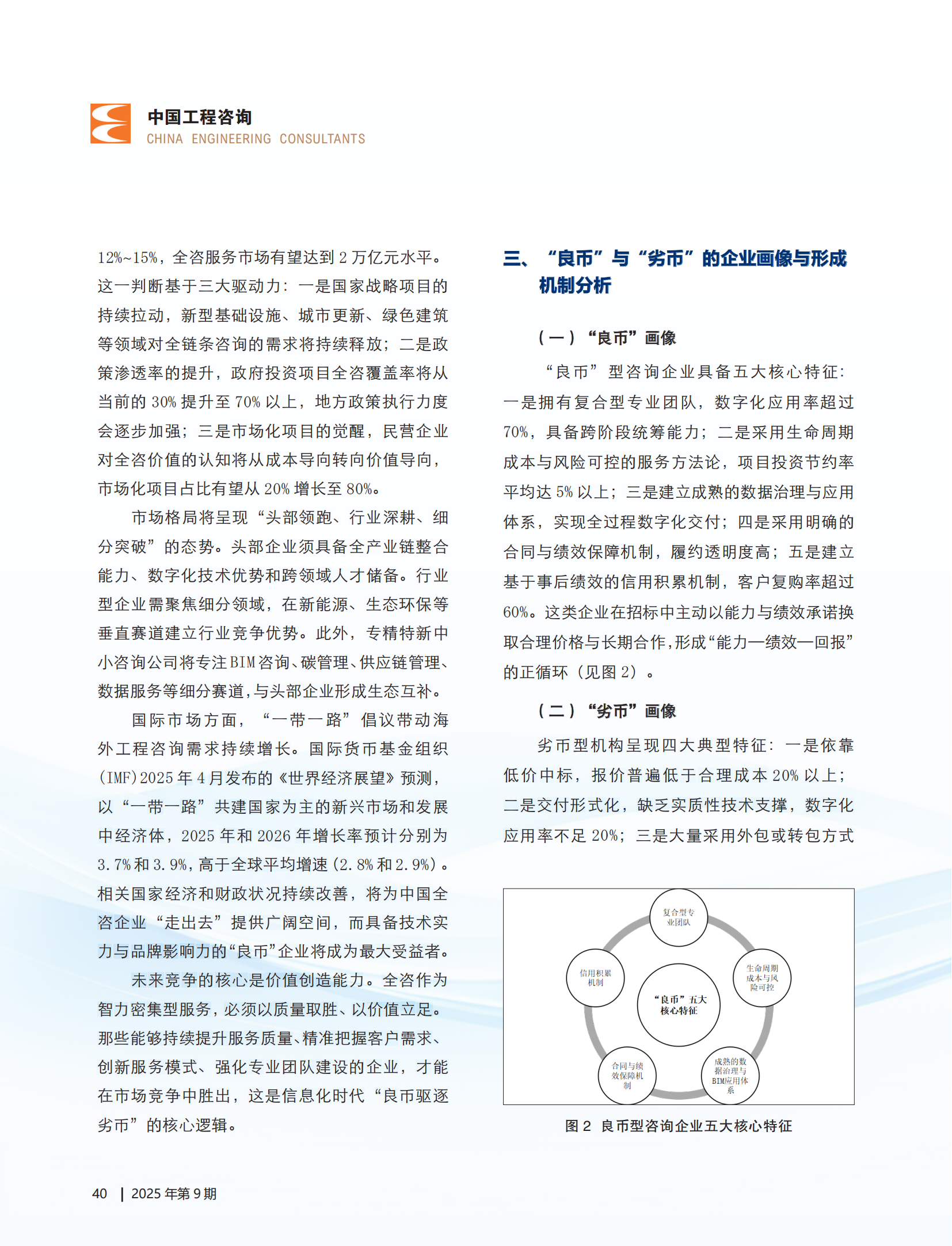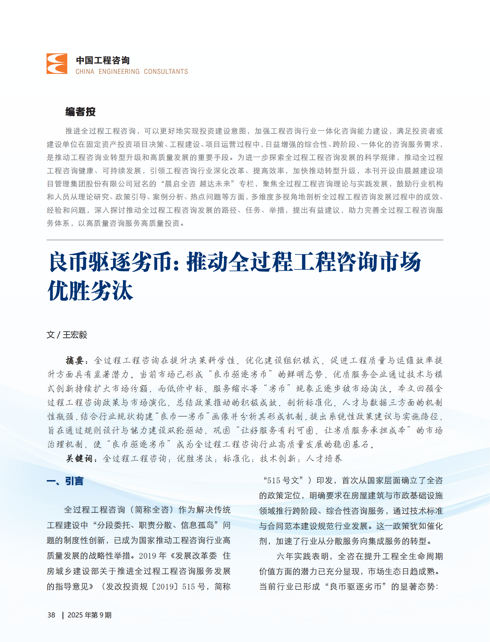 近日,集團(tuán)黨委書記、董事長(zhǎng)王宏毅署名文章 ——《良幣驅(qū)逐劣幣:推動(dòng)全過程工程咨詢市場(chǎng)優(yōu)勝劣汰》在行業(yè)權(quán)威媒體《中國(guó)工程咨詢》雜志刊發(fā)。文章圍繞全咨市場(chǎng)“良幣驅(qū)逐劣幣”這一核心主題,以前瞻性戰(zhàn)略視角深刻剖析全過程工程咨詢市場(chǎng)發(fā)展瓶頸,為構(gòu)建“良幣主導(dǎo)”市場(chǎng)機(jī)制提供了具有理論高度和實(shí)踐價(jià)值的解決方案。文章一經(jīng)發(fā)表,便引發(fā)業(yè)內(nèi)廣泛關(guān)注與熱烈討論。?
