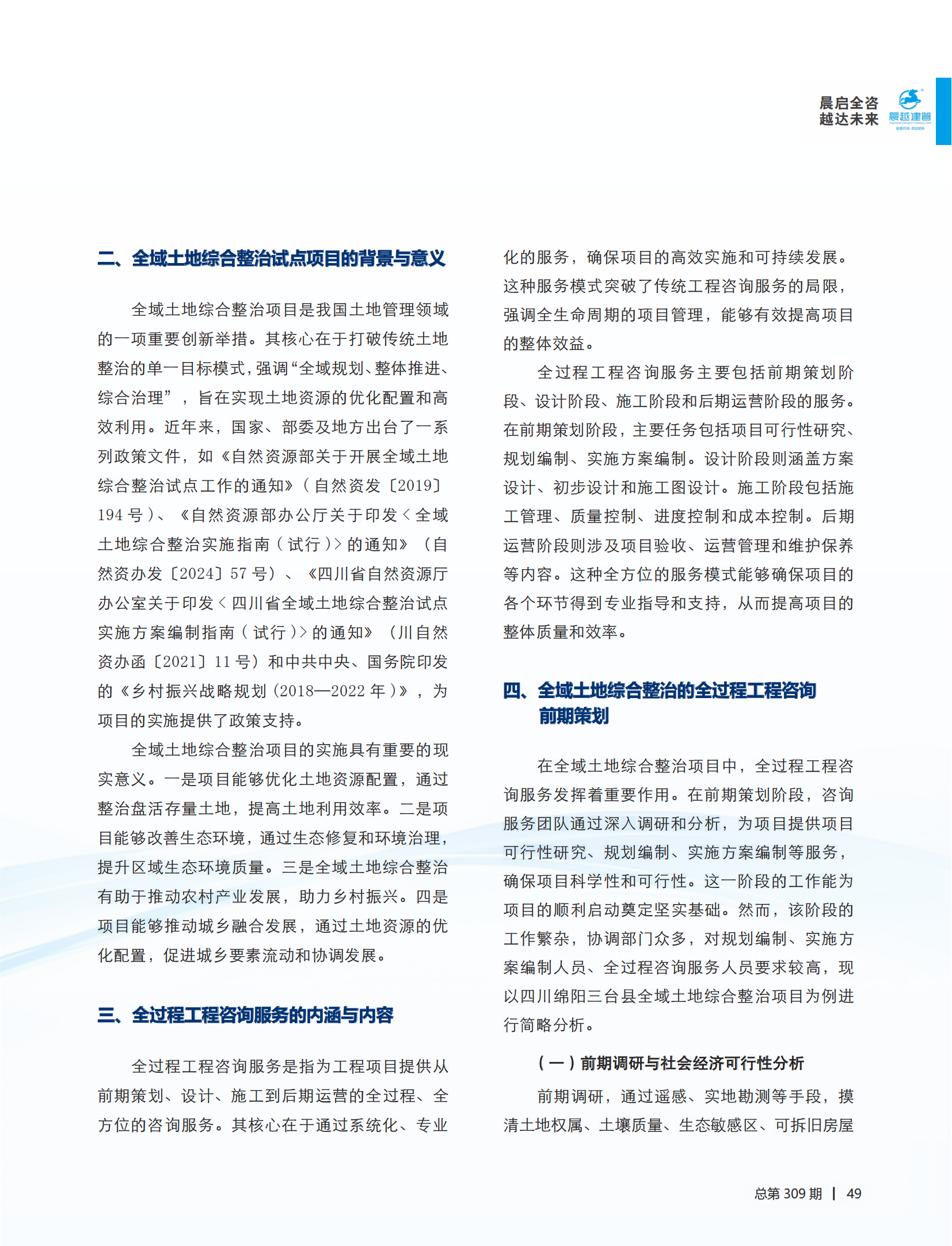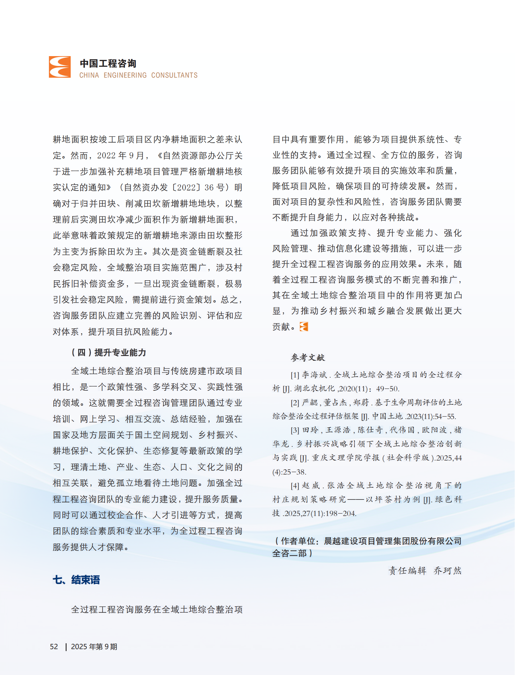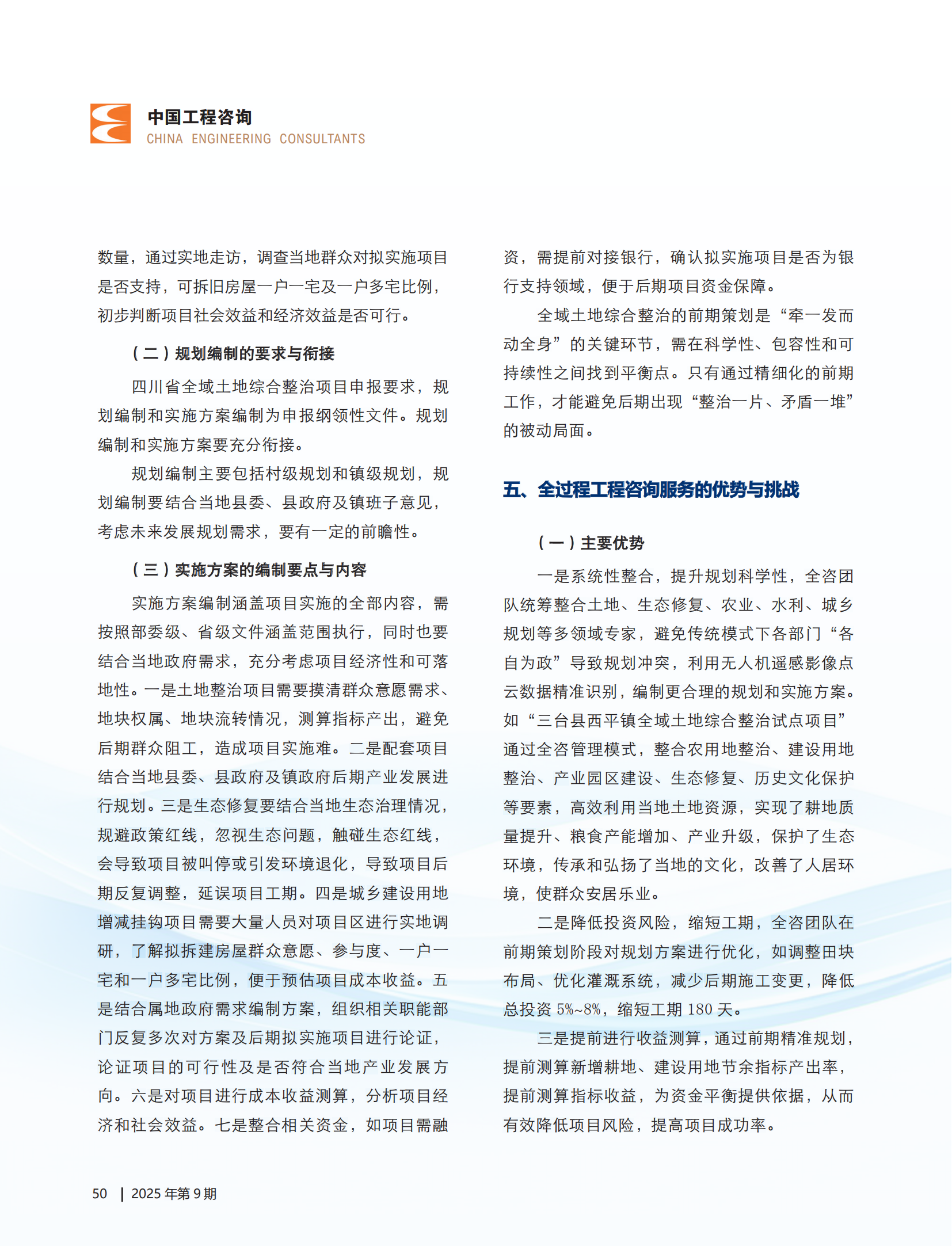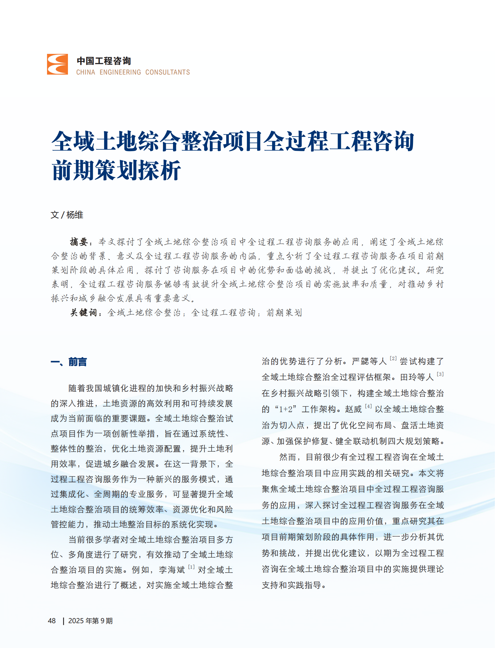 近日,集團(tuán)以四川綿陽三臺縣全域土地綜合整治項目為研究對象的專題文章在《中國工程咨詢》雜志2025年第9期發(fā)表。該文章立足實踐案例,深度剖析了全過程工程咨詢前期策劃環(huán)節(jié)在全域土地整治項目中的核心價值。