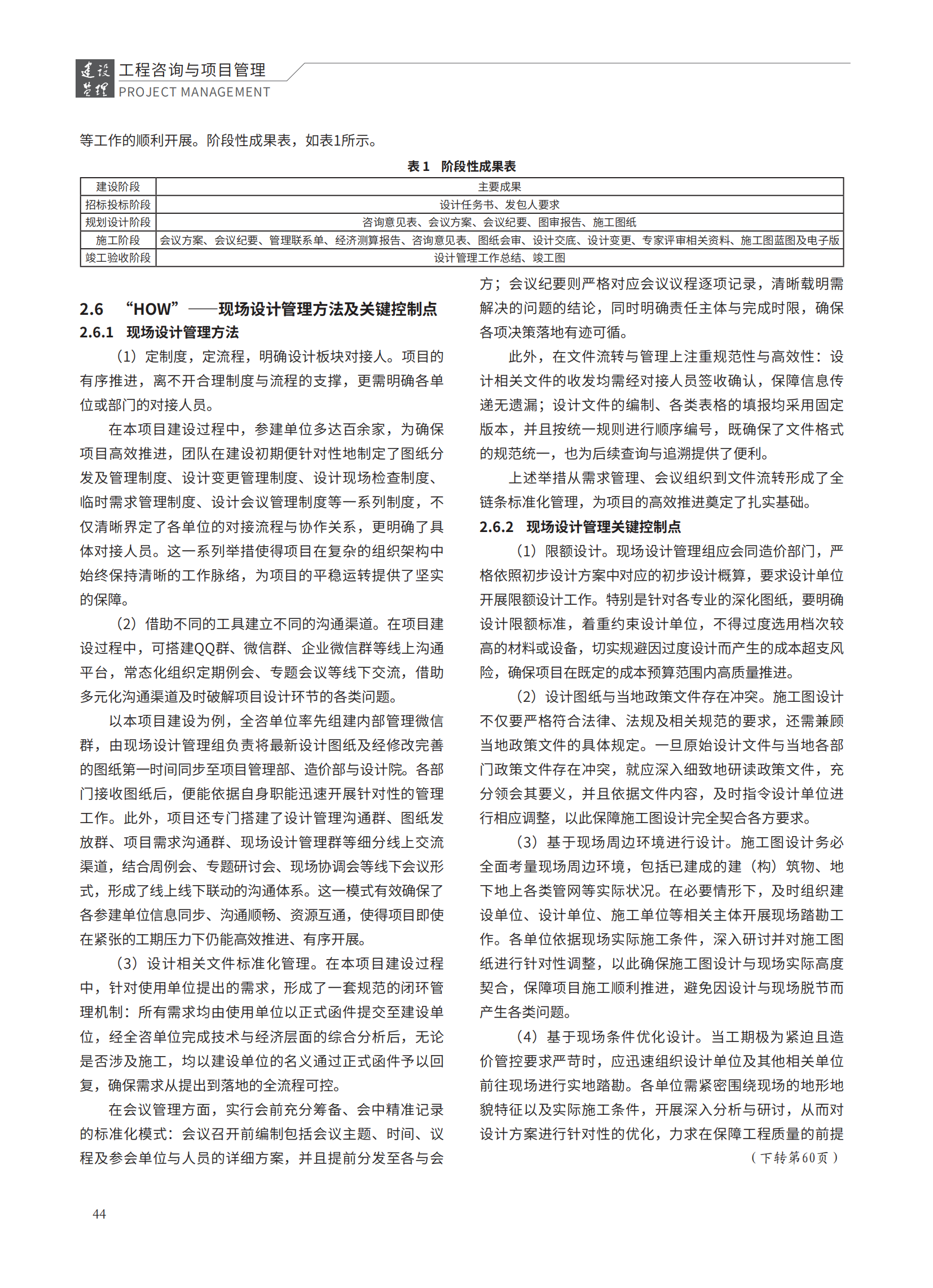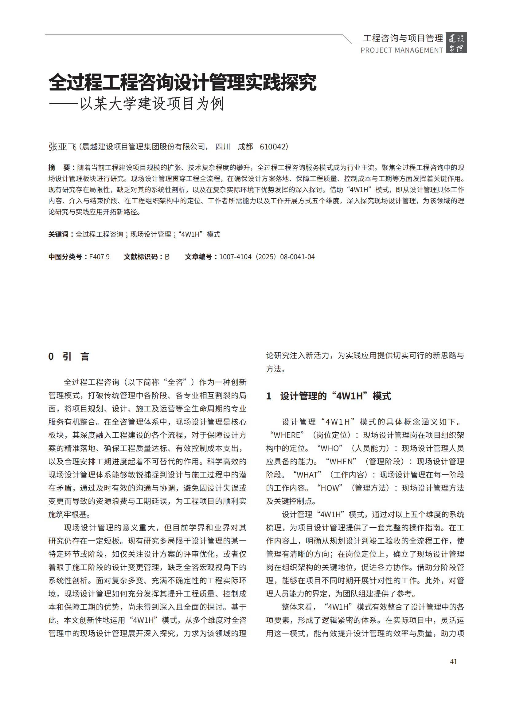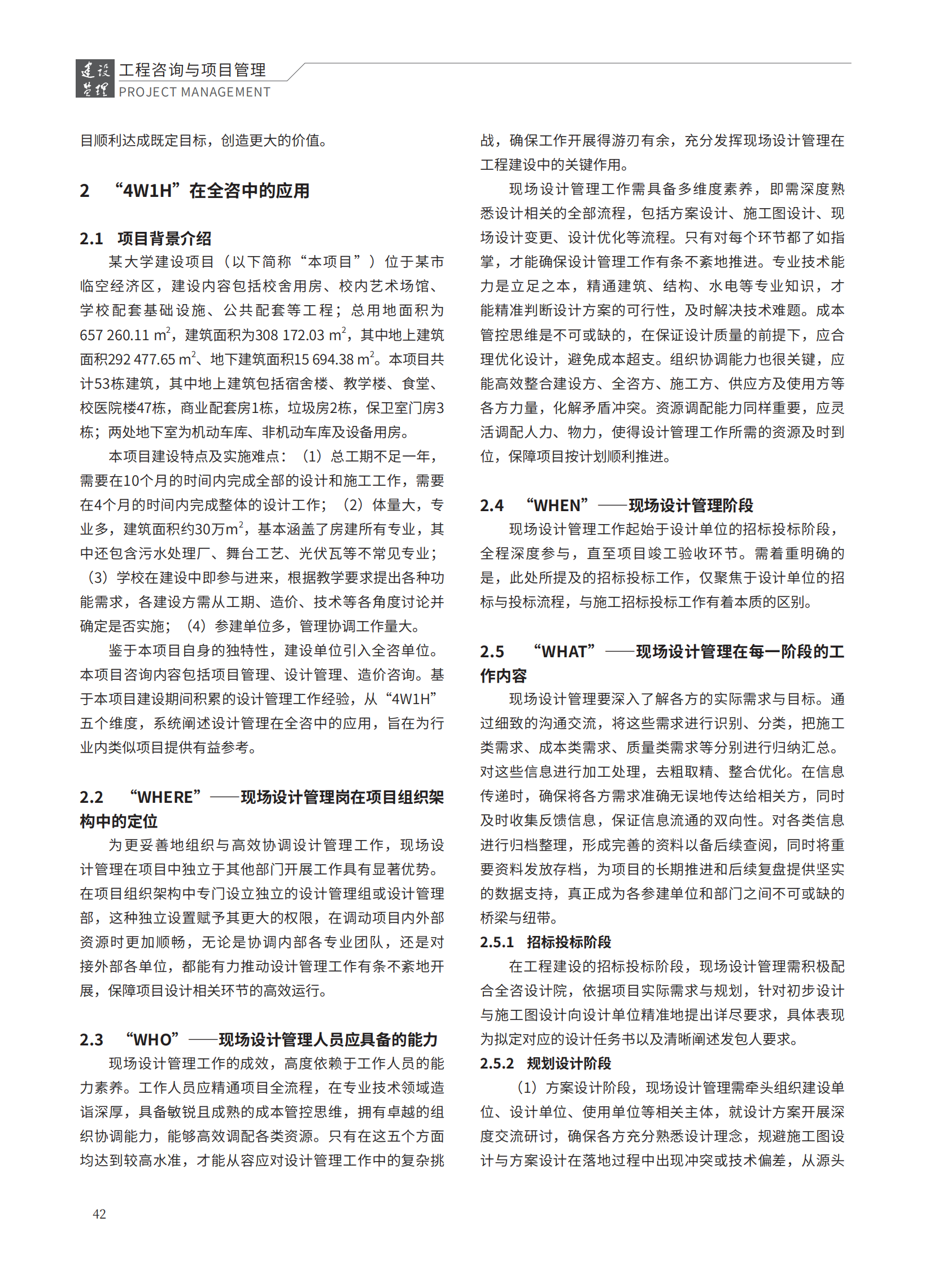 隨著我國工程建設領域進入高質(zhì)量發(fā)展階段,項目規(guī)模持續(xù)擴張、技術復雜程度顯著攀升,全過程工程咨詢已成為驅(qū)動行業(yè)轉(zhuǎn)型升級的主流模式。作為貫穿工程建設全流程的關鍵環(huán)節(jié),現(xiàn)場設計管理在確保設計方案精準落地、保障工程建設質(zhì)量、動態(tài)控制成本與工期等方面發(fā)揮著不可替代的作用。當前行業(yè)研究中,針對現(xiàn)場設計管理的系統(tǒng)性剖析尚存不足,尤其缺乏對復雜工程環(huán)境下其功能優(yōu)勢與實施邏輯的深度探索,相關實踐亟待理論支撐。文章借助“4W1H”模式,系統(tǒng)梳理了現(xiàn)場設計管理崗在項目組織架構(gòu)中的定位、現(xiàn)場設計管理人員應具備的能力、現(xiàn)場設計管理介入與結(jié)束階段、現(xiàn)場設計管理每階段工作內(nèi)容、現(xiàn)場設計管理方法及關鍵控制點,清晰勾勒出其在全過程工程咨詢體系中的運作邏輯與關鍵地位。