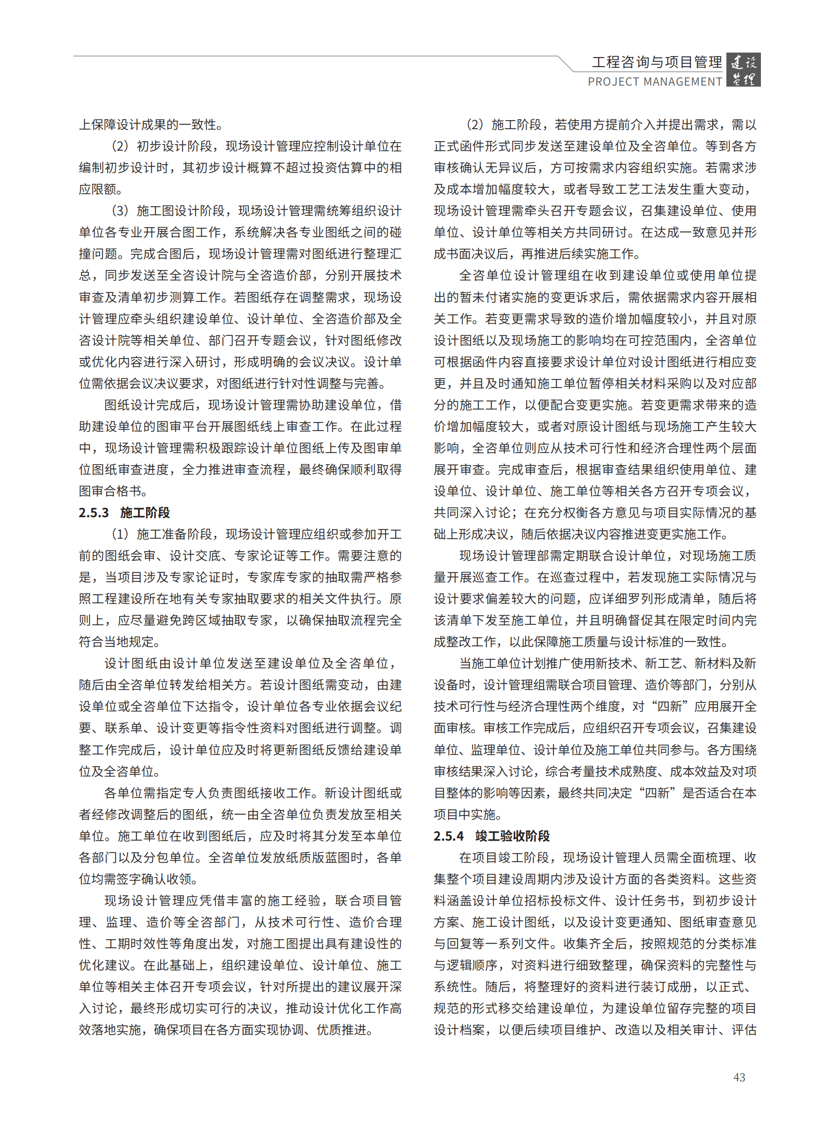 研究表明,現(xiàn)場設計管理通過覆蓋項目全生命周期的精細化管控,在招投標階段的方案籌備、規(guī)劃設計階段的技術把控、施工階段的靈活應變及竣工驗收階段的資料歸檔等關鍵環(huán)節(jié)形成閉環(huán)管理,不僅為設計方案的精準落地提供堅實保障,更在成本優(yōu)化、工期履約與工程質(zhì)量提升等方面產(chǎn)生顯著效益,為全過程工程咨詢模式的深化應用提供了支撐。