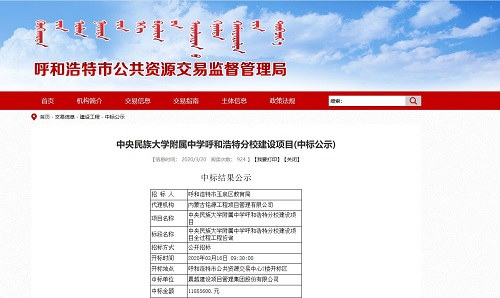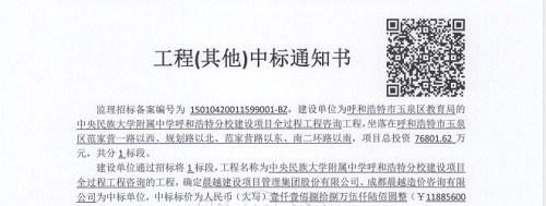 2020年4月2日,晨越建管集團收到呼和浩特市玉泉區(qū)教育局、呼和浩特市玉泉區(qū)住房和城鄉(xiāng)建設局、內(nèi)蒙古銘源工程項目管理有限公司聯(lián)合發(fā)布的中標通知書,確認集團為“中央民族大學附屬中學呼和浩特分校建設項目全過程工程咨詢”的中標單位,中標金額1,188.56萬元,服務內(nèi)容為工程建設管理、招標采購管理、造價咨詢及合同管理、BIM咨詢管理、工程監(jiān)理等全過程工程咨詢服務。具體包括:項目報批報建、招標管理(施工總承包項目招標代理、專業(yè)工程暫估價項目招標代理、其他重要材料設備及服務項目招標代理)、采購管理、計劃管理、勘察管理、設計管理、合同管理、工程造價管理(包括施工總承包工程量清單與最高投標限價的審核、配合國家審計、第三方造價及財務審計工作等)、BIM咨詢管理、資料管理、組織協(xié)調(diào)管理、工程質(zhì)量管理、工程進度管理、施工現(xiàn)場管理、工程監(jiān)理及安全生產(chǎn)監(jiān)督與管理、信息管理及工程保修與移交管理、向業(yè)主提交階段性總結材料和完整的檔案資料。