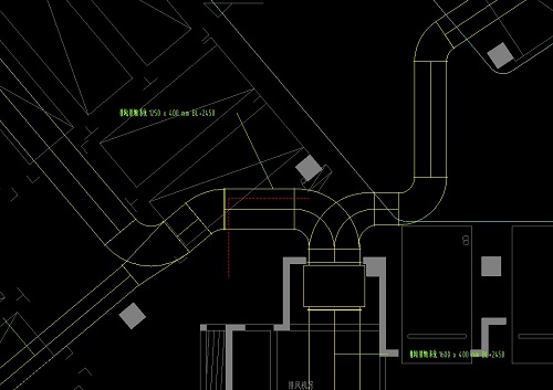 在地下室暖通設(shè)計(jì)中,原暖通設(shè)計(jì)對(duì)整個(gè)地下室進(jìn)行暖通設(shè)計(jì)時(shí),未從施工的角度整體考慮,導(dǎo)致了雖然在設(shè)計(jì)上能滿足左右兩側(cè)的風(fēng)量需求,但忽略了此處對(duì)于施工方的影響;在實(shí)際工程施工中,此處的風(fēng)管造型非常不利于施工,風(fēng)管管件需要特殊定制,施工中必然會(huì)出現(xiàn)細(xì)微偏差,造成左側(cè)或右側(cè)風(fēng)量達(dá)不到設(shè)計(jì)要求,則不滿足使用功能,一旦需要返工整改,施工單位需要重新定制風(fēng)管及管件,無形中對(duì)工期、造價(jià)造成影響。因此,本項(xiàng)目利用BIM技術(shù),通過對(duì)各專業(yè)模型進(jìn)行整合,發(fā)現(xiàn)此處不存在其他管道的影響,從節(jié)約工期的角度上,BIM團(tuán)隊(duì)提出更改風(fēng)管優(yōu)化意見如下:
