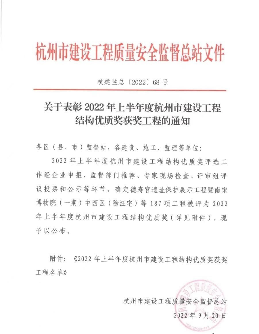 近日,杭州市建設(shè)工程質(zhì)量安全監(jiān)督總站發(fā)布《關(guān)于表彰2022上半年杭州市建設(shè)工程結(jié)構(gòu)優(yōu)質(zhì)獎(jiǎng)獲獎(jiǎng)工程的通知》【杭建監(jiān)總[2022]68號(hào)】文件,公布由集團(tuán)承擔(dān)全過程工程咨詢服務(wù)的浙江省杭州市“臨政工出[2021]年產(chǎn)萬噸山核桃加工工廠項(xiàng)目”(姚生記數(shù)字觀光工廠)獲得“杭州市建設(shè)工程結(jié)構(gòu)優(yōu)質(zhì)獎(jiǎng)”。