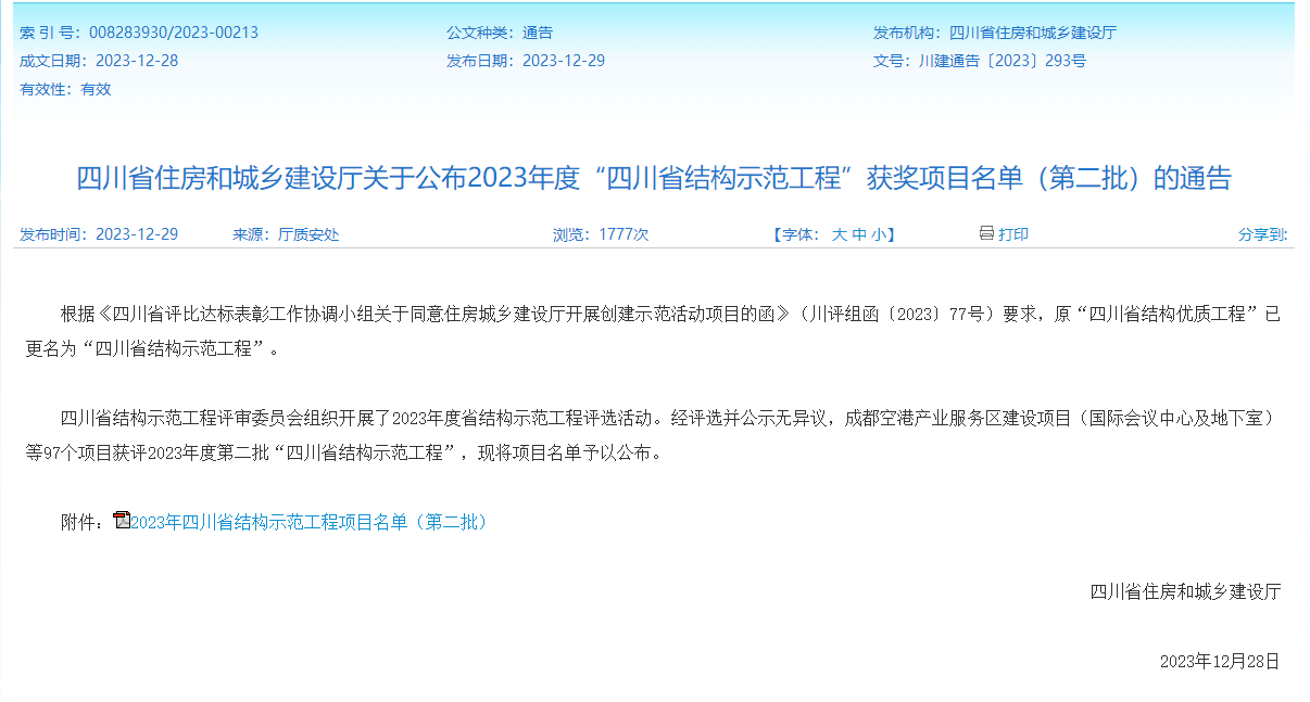 近日,四川省住房和城鄉(xiāng)建設(shè)廳發(fā)布了2023年度“四川省結(jié)構(gòu)示范工程”獲獎(jiǎng)名單(第二批),晨越建管集團(tuán)監(jiān)理的綿陽(yáng)市中醫(yī)醫(yī)院制劑中心建設(shè)項(xiàng)目獲獎(jiǎng)。