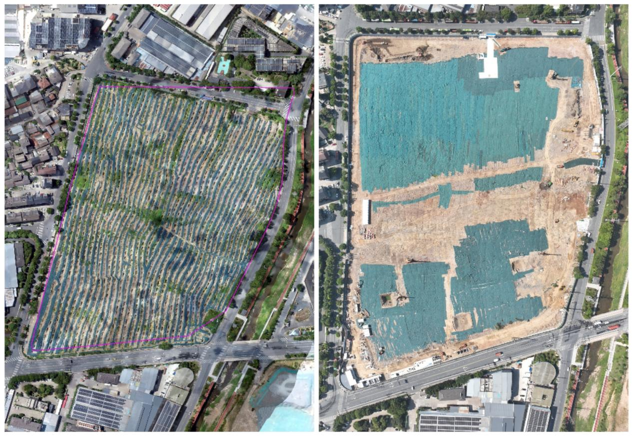 二期工程地塊原貌(左)及施工準(zhǔn)備階段(右)