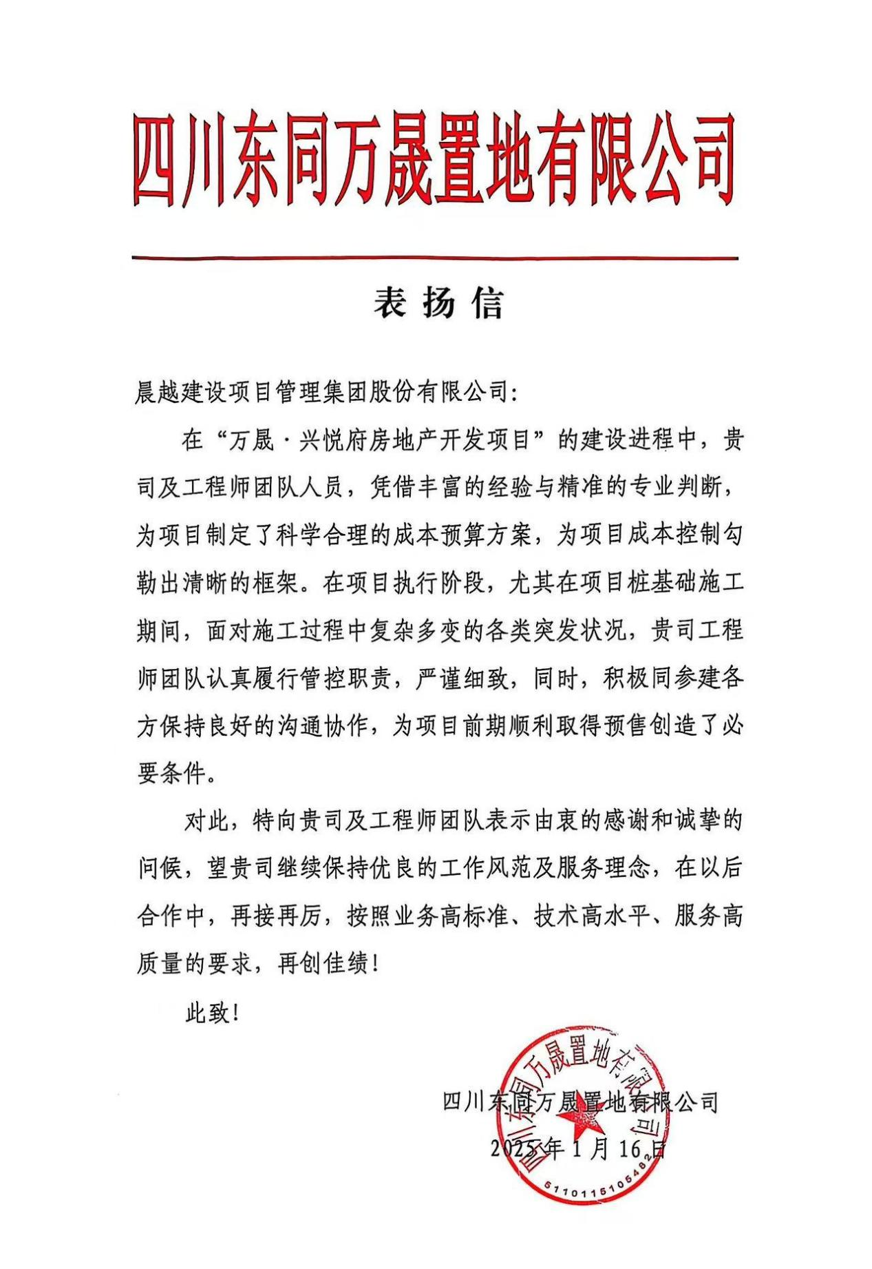 近日,集團(tuán)收到四川東同萬(wàn)晟置地有限公司發(fā)來(lái)的《表?yè)P(yáng)信》,對(duì)集團(tuán)及項(xiàng)目團(tuán)隊(duì)表示由衷的感謝,對(duì)項(xiàng)目部取得的成績(jī)給予表?yè)P(yáng)。